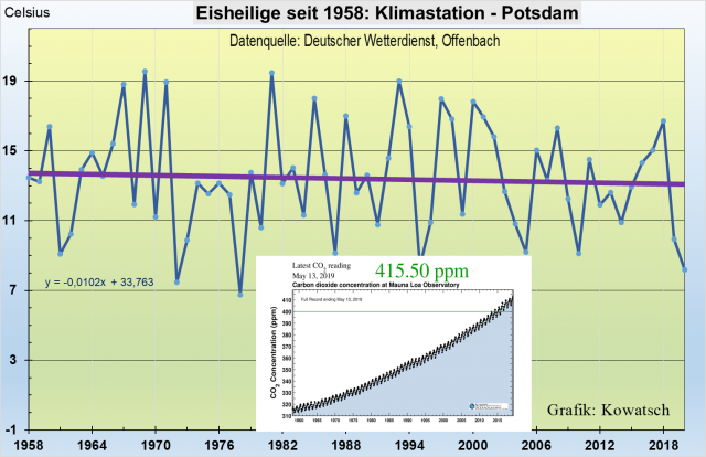 Da die Station Potsdam schon länger existiert als Goldbach wäre interessant, ob es 1) noch kältere Eisheiligenjahre gegeben hat und 2) wie sich die fünf Eisheiligentage seit 1958 entwickelt haben. 1958 deshalb, weil seitdem die CO2-Konzentration der Luft am Mouna Loa zentral für die irdische Atmosphäre erfasst wird.
