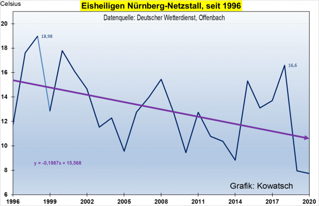 Grafik 6: Die Süddeutsche Wetterstation beim Aussiedlerhof Netzstall, Nähe Nürnberg zeigt ebenfalls seit 25 Jahren ein deutliches Kälter werden der Eisheiligen. Anstatt Netzstall hätte man auch die Grafik von Bad-Kreuznach nehmen können, die Trendlinie hat eine negative Steigung von: y = – 0,14 x in den letzten 25 Jahren