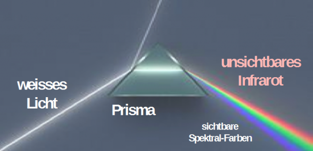 Wie gesagt, infrarote Strahlung kann der Mensch nicht sehen, sondern allenfalls ab einer gewissen Intensität spüren, etwa wenn man eine Hand über eine heiße Herdplatte hält – in gebührendem Abstand natürlich. Infrarote Strahlung geht auch nicht durch das Glas-Prisma, kann aber mit anderen Techniken nachgewiesen und gemessen werden.