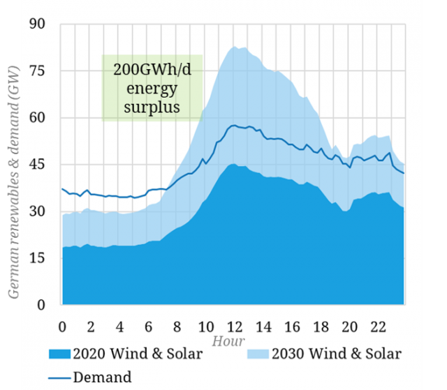 Die Mengen an überschüssiger Energie sind zu groß, um sie zu speichern, wenn keine wichtige neue Quelle für flexiblen Bedarf vorhanden ist (z. B. Wasserstoffelektrolyse in großem Maßstab, die robust gegen Unterbrechungen sein müsste). Der Export großer Mengen über Verbindungsleitungen ist auch eine Herausforderung, wenn es in benachbarten Märkten korellierte Wind- und Solarmuster gibt.