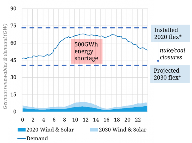 Im Gegensatz dazu verringert sich die abrufbare flexible Back-up Kapazität bis 2030 um mehr als 30 GW. Durch Abschaltungen von Kernkraftwerken, Kohle und Braunkohle wird die blaue gestrichelte Linie auf ein Niveau gesenkt, das über den Tag hinweg einen Energieengpass von ca. 500 GWh hinterlässt. (Alle gelieferte und abrufbare Energie zusammen liegen unterhalb des Bedarfs). Dies entspricht 250 GW einer durchschnittlichen Speicherdauer von 2 Stunden (wenn der Speicher vorher voll ist).