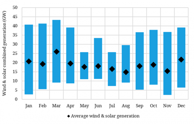 Grafik 2: Durchschnittliche, minimale und maximale deutsche Wind- und Sonnenleistung im Jahr 2019
