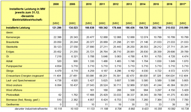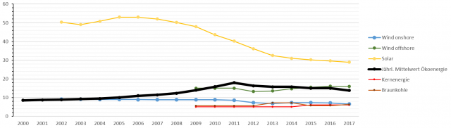 Leider enden die Daten mit dem Jahr 2017. Trotzdem sieht man, wie teuer die Ökoenergie im Vergleich zu konventionell erzeugter in Wirklichkeit immer noch ist.