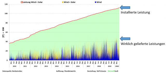 Herr Schuster von VERNUNFTKRAFT. Landesverband Hessen e.V. hat gerade eine Übersicht zur Ökoenergie zusammengestellt. Diese geben einen ergänzenden Überblick zwischen dem, was der Professor fabuliert und dem, was die Ökoenergie in Wirklichkeit (nicht) „leistet“. Anbei Grafiken daraus.