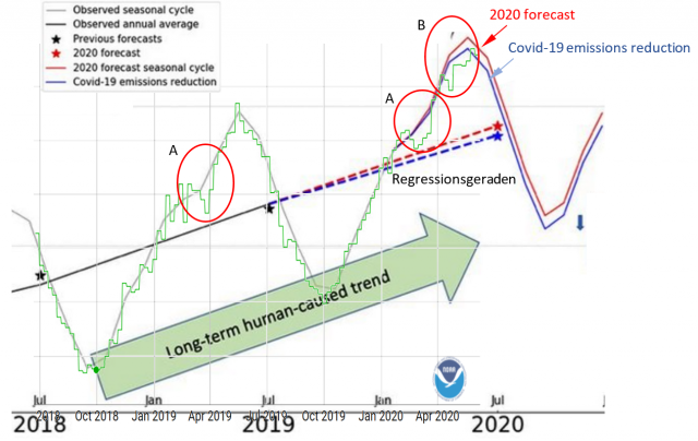 In der Grafik von Prof. Rahmstorf ist die für das Jahr 2020 rot gezeigte „2020 forecast seasonal-cycle“-Regressionslinie eine lineare Weiterführung der Regression ab Juni 2018. Die „Covid“-reduzierte, blaue Linie „Covid-19 emissions reduction“ zeigt dagegen eindeutig eine Abschwächung.