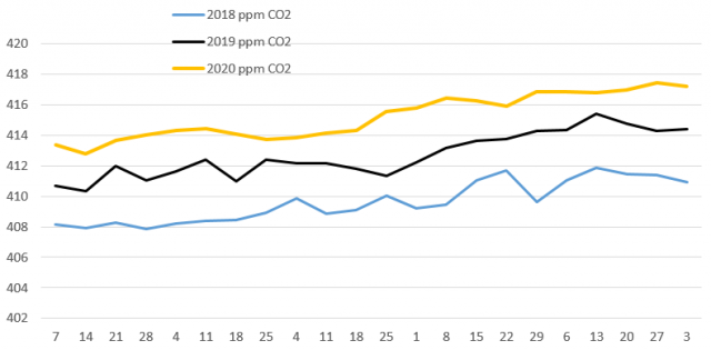 [1] … In den letzten Monaten gab es keine Anzeichen für eine Reaktion des atmosphärischen CO2. Die Trendzahlen für 2020 liegen sogar über der Regressionslinie. Das verspricht etwas, wenn wir in den Niederlanden die CO2-Emissionen “ für das Klima “ um einen wahnsinnigen Betrag von vielen, vielen Milliarden Euro reduzieren. Und nicht zu vergessen die 1000 Milliarden Frans Timmermans.