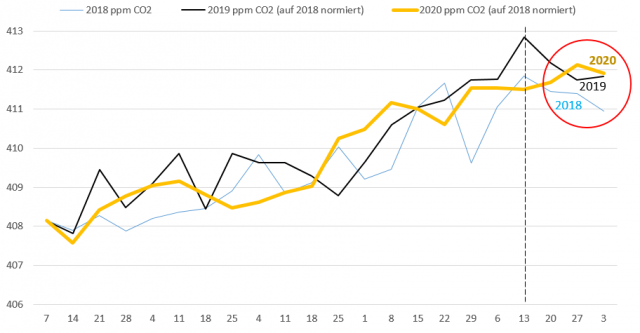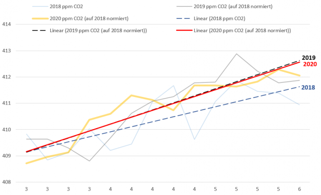 Herr Kuntz, der Corona-Einfluss auf die CO2-Konzentration ist wegen der kurzen Zeit sehr gering. Wenn wir einfach mal 2,5 Monate und weltweit -20% annehmen und einen sonst jährlichen Anstieg um 2,5 ppm, so ergäbe das eine Differenz von 2,5/24=0,1 ppm (das wäre im Gleichgewicht eine Temperaturdifferenz von 0,0002 Grad). Das liegt weit unter der Nachweisgrenze, also ist die Suche danach witzlos. Da aber der ppm-abhängige Senkenfluss-Anteil sich nicht auf die Hälfte verringert, wäre der Effekt sogar nur halb so gross.