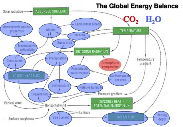 Globales Energie Budget mit den wichtigsten Einflussgrößen und Abhängkeiten, Grafik Willy Soon