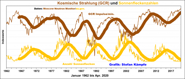 Abbildung 1: Verlauf der Intensität der Kosmischen Strahlung (GCR = Galactic Cosmic Ray) und der Sonnenaktivität (Sonnenfleckenzahlen) in monatlicher Auflösung zwischen Januar 1962 und April 2020. Man erkennt ein spiegelbildliches Verhalten – leicht zeitlich verschoben. Mit der aktuell sehr geringen Sonnenaktivität erreicht die Kosmische Strahlung sehr hohe Werte; außerdem war sie, bedingt durch die zwischen den späten 1970ern und den frühen 2000er Jahren sehr aktive Sonne, in der Mitte des Zeitraumes insgesamt geringer. Wegen der sehr unterschiedlichen Größen mussten beide Größen in Indexwerte umgerechnet werden, um sie gemeinsam in einer Grafik darstellen zu können.