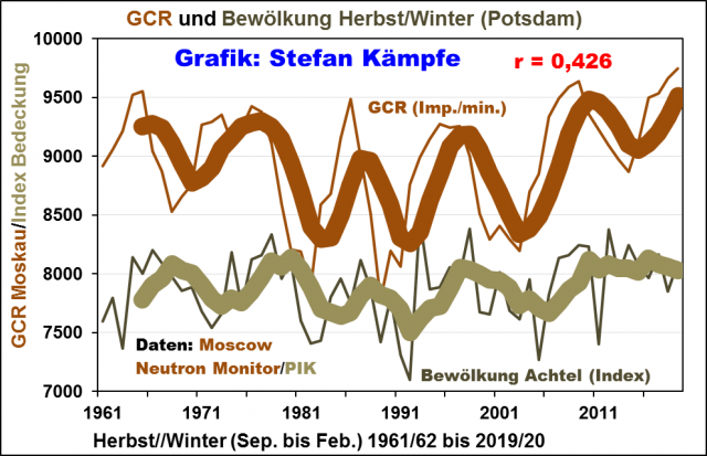 Fast identische Ergebnisse zeigen sich bei der Analyse der GCR-Reihe aus Oulu/Finnland. Weil diese aber nur bis 1964 zurückreicht, wird im Folgenden die Beobachtungsreihe der Kosmischen Strahlung aus Moskau verwendet.