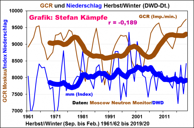 Beim Niederschlag wird im selben Betrachtungszeitraum keine Signifikanz erreicht, doch deuten sich in Phasen erhöhter Kosmischer Strahlung etwas geringere Herbst- und Winterniederschläge über Deutschland an: