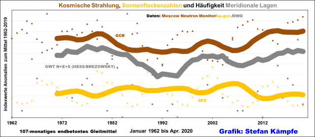 Für langfristige Betrachtungen (die Häufigkeitsverhältnisse der Großwetterlagen, Niederschlags- und Temperaturmittel reichen in Deutschland bis immerhin 1881 zurück) stehen nur die Sonnenfleckenzahlen zur Verfügung; sie bilden leider die solare Aktivität nur sehr grob ab. Ein besserer Indikator ist die leider erst seit etwa 1960 aufgezeichnete Intensität der so genannten Kosmischen Strahlung – keine Strahlung im physikalischen Sinne, sondern ein hochenergetischer Teilchenstrom, der von der Sonne, der Milchstraße und fernen Galaxien kommt. Sie besteht vorwiegend aus Protonen, daneben aus Elektronen und vollständig ionisierten Atomen. Näheres dazu unter anderem beim Stichwort „SVENSMARK-EFFEKT“. Ihre Intensität verhält sich in etwa spiegelbildlich zur Sonnenaktivität; die Sonnenaktivität schirmt entsprechend ihrer wechselnden Stärke den Einfluss der galaktischen Strahlung von der Erde mehr oder weniger ab.