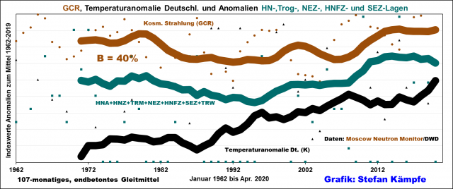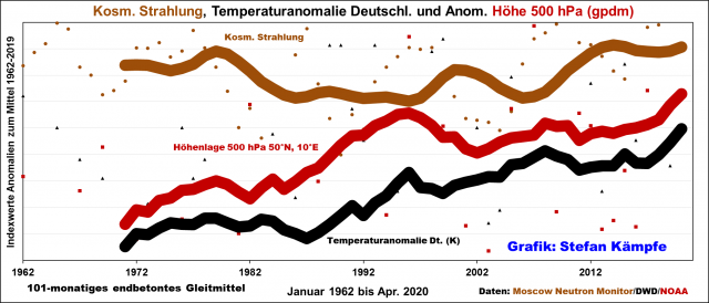 Für die langfristige Temperaturentwicklung in Deutschland ist die Höhenlage der 500-hPa-Fläche von Bedeutung – je höher sie liegt, desto wärmer ist es tendenziell, von wenigen Inversionswetterlagen abgesehen, in bodennahen Luftschichten. Die Höhenlage der 500-hPa-Fläche stieg in den letzten Jahrzehnten stark an, was den Temperaturanstieg in Deutschland erklärt, doch scheint der Anstieg in Phasen mit erhöhter Kosmischer Strahlung gebremst zu werden: