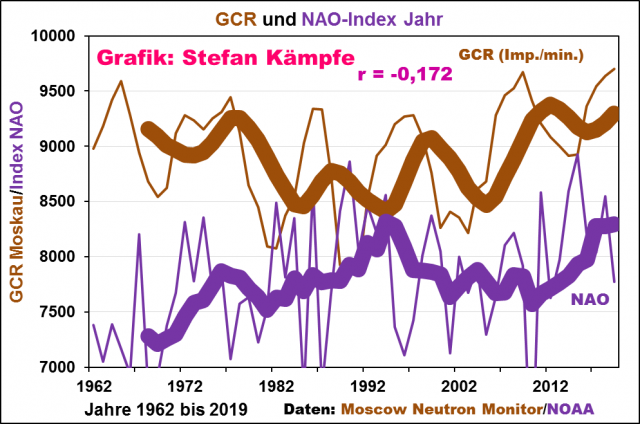 Da es sich bei den beeinflussten Wetterlagen um solche handelt, die in negativen NAO-Phasen auftreten, bietet sich ein Blick auf den Zusammenhang zwischen NAO und Kosmischer Strahlung geradezu an. Er ist nicht signifikant negativ, aber trotzdem erkennbar: