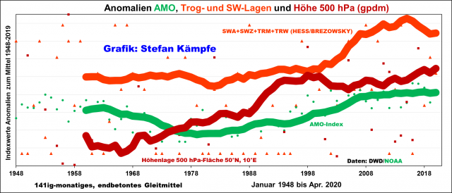 Abbildung 8: In AMO-Warmphasen scheint die 500-hPa-Fläche über Deutschland höher zu liegen; außerdem häufen sich dann Trog- und Südwestlagen. Werte der 500-hPa-Fläche ab 1948 verfügbar. Die sehr unterschiedlichen Größen mussten, um sie in einer Grafik darstellen zu können, in Indexwerte umgerechnet werden.