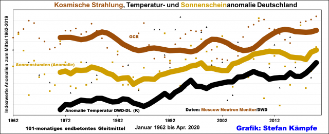 Abbildung 9: Mit der steigenden Sonnenscheindauer stiegen die Lufttemperaturen in Deutschland – eine Beeinflussung durch die Intensität der Kosmischen Strahlung ist nur minimal erkennbar. Die sehr unterschiedlichen Größen mussten, um sie in einer Grafik darstellen zu können, in Indexwerte umgerechnet werden.
