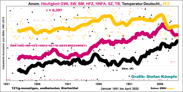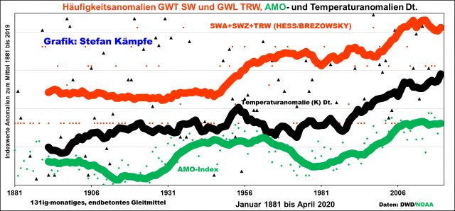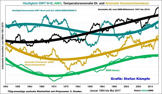Weil die Daten des DWD-Flächenmittels der Sonnenscheindauer immerhin bis 1951 zurückreichen, bot sich die Errechnung eines zentralen Gleitmittels zusammen mit Temperatur- und AMO-Anomalie und der Häufigkeitsanomalie der insgesamt leicht kühlend wirkenden Nord- und Ostwetterlagen an: