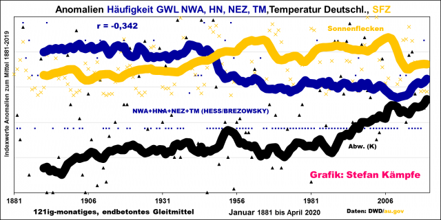 Abbildung12: Tendenziell weniger antizyklonale Nordwest-, Hoch Nordmeer-, zyklonale Nordost- und Tief Mitteleuropa-Lagen in Zeiten mit hoher Sonnenaktivität (viele Sonnenflecken). Alle diese Lagen wirken außerdem insgesamt mehr oder weniger kühlend. Die sehr unterschiedlichen Größen mussten, um sie in einer Grafik darstellen zu können, in Indexwerte umgerechnet werden.