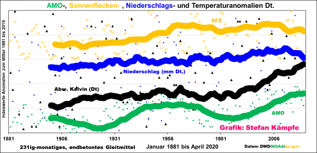 Abbildung 13: Insgesamt mehr Niederschläge bei höherer Sonnenaktivität. Die AMO ist zur Orientierung mit abgebildet. Die sehr unterschiedlichen Größen mussten, um sie in einer Grafik darstellen zu können, in Indexwerte umgerechnet werden.
