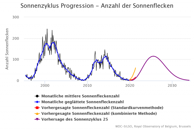 Ähnliches sieht auch der amerikanische Wetterdienst NOAA vorher – kein neues Maunder-Minimum, aber einen relativ schwachen 25. Sonnenfleckenzyklus.