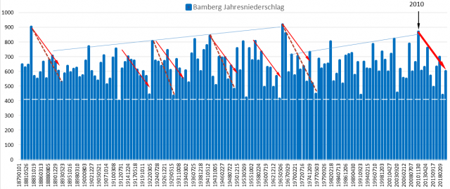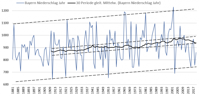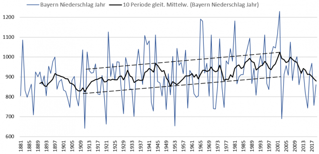 … Die Zeitreihe der jährlichen Niederschläge in Deutschland (Gebietsmittel) zeigt einen leichten Anstieg, der mit einer Irrtumswahrscheinlichkeit von 5 %-Niveau statistisch signifikant ist. Dieser Anstieg ist im Wesentlichen darauf zurückzuführen ist, dass bis etwa 1920 nur selten überdurchschnittlich niederschlagsreiche Jahre aufgetreten sind.