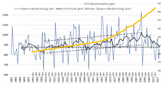 Würde dies stimmen, dann hätte sich der Niederschlag vorher über 100 Jahre lang nach der „falschen“ CO2-Regel verhalten. Und nun, infolge weiteren Emissionsanstiegs durch „Besinnen“ auf die angeblich „richtige“, ausgerechnet den Niederschlag zu Beginn des „Klimawandels“ , mit dem damals geringem CO2-Anteil erreicht.