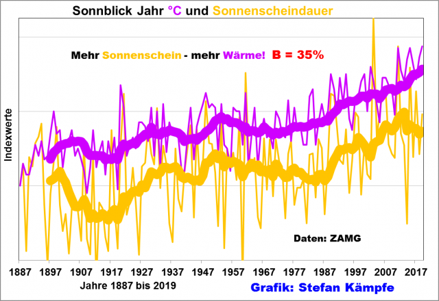 Abbildung 2: Die tendenziell stark zunehmende Sonnenscheindauer (gelb) am Sonnblick in Österreich beeinflusste die dortige Variabilität der Lufttemperaturen (pink) selbst im Jahresmittel zu mehr als einem Drittel – Sven Plöger deutet diese Problematik kurz an. Seit 1887 nahm dort die jährliche Sonnenscheindauer um mehr als 230 Stunden zu – Ähnliches zeigt sich im gesamten Alpenraum. Die weitaus stärkste Erwärmungswirkung der Sonne findet im Sommerhalbjahr statt, doch im Gegensatz zum Flachland wirkt in den Hochlagen auch die Wintersonne zumindest leicht erwärmend – Dank der besonders klaren Bergluft, der Inversionslagen und der Südhänge, welche, anders als ebenes Gelände, gerade bei tiefem Sonnenstand viel Strahlung empfangen. In AMO-Warmphasen (momentan) ist es sonniger, außerdem trugen die Luftreinhaltemaßnahmen, geänderte Wetterlagenhäufigkeiten sowie die Austrocknung der Landschaft durch Melioration und Besiedlung zur stärkeren Besonnung bei. Weil Lufttemperatur und Sonnenscheindauer sehr unterschiedliche Größen sind, mussten sie zur Veranschaulichung in einer Grafik in Indexwerte umgerechnet werden.