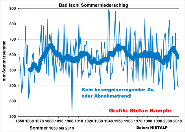 Abbildung 3: Schwankende, aber keinesfalls merklich zu- oder abnehmende Sommerniederschläge in Bad Ischl (Österreich). Ähnlich sieht das an fast allen Alpen-Stationen aus. Und Starkregen oder Unwetter sind (leider schon immer!) ein wesentliches Merkmal des Alpenklimas; sie treten dort viel häufiger und intensiver auf, als im Flachland.