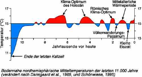 Abbildung 4 zeigt: Vor etwa 6500 Jahren wurden in unserer, noch anhaltenden Warmzeit, dem Holozän, die bislang höchsten Temperaturen erreicht, von denen der aktuelle Klimawandel noch weit entfernt ist. Die Alpengletscher waren damals noch kleiner als heute oder fehlten völlig; in Gletschereis eingeschlossene Baumstämme belegen diese Tatsache. „Ötzi“ wurde (vermutlich) durch eine Abkühlungsphase am Übergang zur Bronzezeit konserviert. Einer weiteren, markanten Warmphase folgten weitere Schwankungen, bis mit dem Beginn des „Römischen Optimums“ Hannibal noch im Herbst über die Alpen nach Italien einfallen konnte; Weinbau und Besiedlungstätigkeit breiteten sich aus. In der Abkühlungsphase des „Dunklen Zeitalters“ ab etwa 400 n. Chr. gingen Infrastruktur und Wissen der Römer weitgehend verloren; doch in der „Mittelalterlichen Warmzeit“ erlebten Mitteleuropa und der Alpenraum eine weitere kulturelle Blütezeit. Die „Kleine Eiszeit“ führte ab etwa 1300 zu vermehrten Unwettern und einem starken Gletscherwachstum. Noch vor kaum 200 Jahren wurde für das Anhalten der talwärts vorrückenden Gletscher gebetet, welche Siedlungs- und Nutzland bedrohten. Erst ab 1900 setzte dann der aktuelle Klimawandel ein.