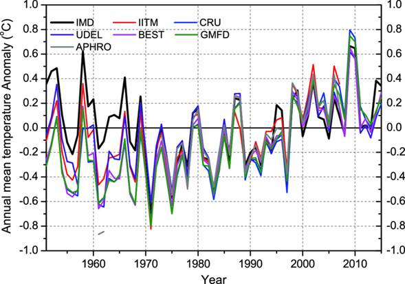 Die indischen Anomalien der durchschnittlichen jährlichen Lufttemperatur an der Landoberfläche (oberflächennahe Temperatur) zeigen, dass das Klima in den letzten zwei Jahrzehnten nicht wärmer war als in der Zeit zwischen 1950 und 1970.