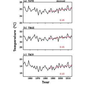 Abb. 2: Zeitreihen von ganz Indien, gemittelte Jahresmittelwerte (TAVE), Maximum (TMAX) und Minimum (TMIN) der Oberflächenlufttemperaturen zwischen 1951 und 2015. Jüngste Veränderungen werden auf der Grundlage linearer Trends (gestrichelte rote Linie) über den 30-jährigen Zeitraum 1986-2015 berechnet.
