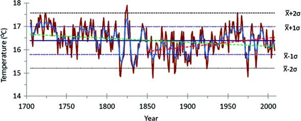 Während Klimarekonstruktionen für spätsommerliche Temperaturen in Sikkim (Abb. 3) eine Erwärmung von etwas mehr als 1° C von 1850 bis 2008 zeigen, geht daraus auch ein „leichter Abkühlungstrend [etwa 0,2° C] seit 1705“ hervor, eine ausgeprägte Abkühlung (fast 2° C) nach den späten 1960er Jahren und die höchsten Temperaturwerten um das Jahr 1825.