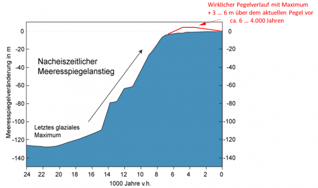 Dazu eine Grafik, in welcher man von den 2-3 m Anstieg zwischen den „7000 und 3000 Jahren v.h.“ nichts erkennen kann.