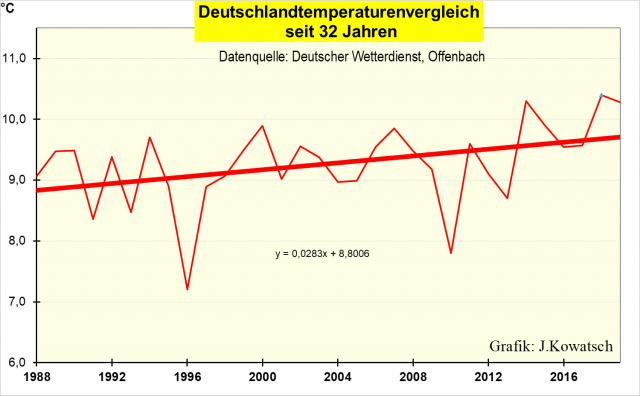 Grafik 2: Erst ab 1988 erfolgte der Temperaturanstieg der Jahrestemperaturen in Deutschland, die „Klimakatastrophe“ begann also erst 1988. Laut Trendlinie mit einer Erwärmung von knapp 1 Grad seit 1988