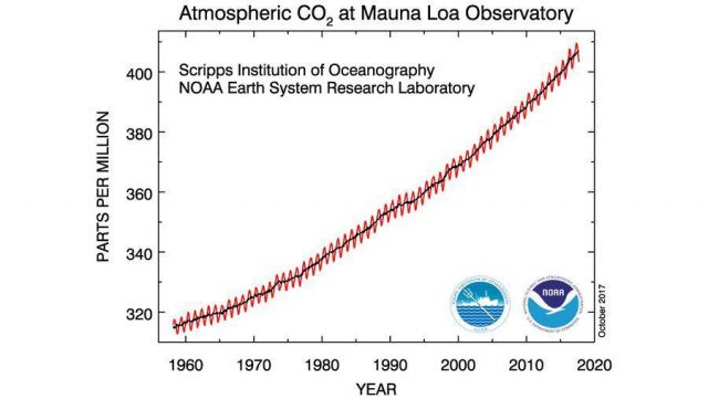 Zufälligerweise sind nun die CO2-Konzentrationen in diesem Zeitraum ebenfalls angestiegen, was den Treibhaus-Erwärmungsgläubigen in die Argumentation spielt. Genauer gesagt, seit 1958 wird die CO2-Konzentration auf dem Mouna Loa erfasst, die gemessenen Daten gelten weltweit, da sich CO2 gleichmäßig in einem Raum verteilt.