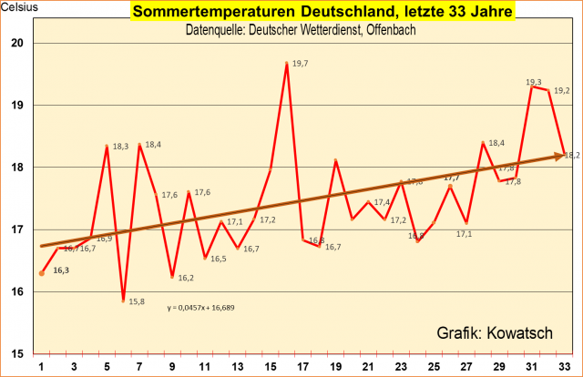 Noch eine kurze Erklärung zur Trendlinienberechnung von excel. Eine Trendlinie gibt nicht die Zukunft wieder, sondern nur den Verlauf im betreffenden ausgewählten Zeitabschnitt. Grafik 4: Die Sommertemperaturen sind in den letzten 33 Jahren stark gestiegen. Keinesfalls müssen die Sommertemperaturen weiter steigen. Soweit die allgemeine Aussage. Das stimmt bei Excel nicht immer. Bei Grafik 5 ist erwähnt, dass die Trendlinie eigentlich eine Horizontale sein müßte. Excel hat seine Trendlinienberechnung wahrscheinlich aus dem Aktienmarkt übernommen. Waren die letzten 5 Werte über dem Gesamtschnitt, dann zeigt die Trendlinie automatisch leicht nach oben, da bei Aktien aufgrund der guten Auftragslage der letzten 5 Jahre bei einer Firma ein weiterer Anstieg zu erwarten ist. Excel Trendlinien wollen also durchaus ein klein wenig die Zukunft beschreiben. Was für eine Firma gilt, gilt für das Wetter natürlich überhaupt nicht.