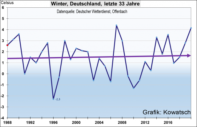 Sehr geehrter Herr Kowatsch. Zu Ihrer Arbeit habe ich einige Fragen bzw. Anmerkungen. Vorneweg: Ich bin weder Treibhausgläubiger noch Erwärmungsjünger. Schade, dass Sie Ihre sonst wohltuend sachlichen Ausführungen mit dieser Polemik würzen müssen. Aber gut: Ich habe mich gewundert, warum Sie in Ihrer Wetterbilanz nicht den in der Klimaforschung üblichen 30-Jahre-Zeitraum wählen, sondern 33 Jahre. Das ist entweder Zufall, oder aber bewusst manipulativ: Denn just die Winter 1988, 1989 und 1990 waren in Deutschland außergewöhnlich mild mit 2,6 und 3,1 sowie 3,6 Grad (Zeitreihe des Deutschen Wetterdienstes). Im langjährigen Mittel liegen die Wintertemperaturen um die 0 Grad. Der Februar 1990 lieferte mit +5,74 Grad sogar einen Temperaturrekord. Wenn Sie Ihre Trendlinie also in diesen milden Winter beginnen, sehen Sie zwangsläufig keine weitere Erwärmung. Sie können das selber nachvollziehen: Beginnen Sie 1991 (Winter 0,0 Grad) oder aber 1985 (Winter – 2,5 Grad), dann sieht Ihre Grafik ganz anders aus.