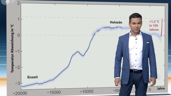 „Der Wetterbericht des „Heute Journal“ im ZDF am 24. Juli wartete mit einer vermeintlichen Sensation auf. Moderator Özden Terli präsentierte eine Grafik, die den Verlauf der globalen Durchschnittstemperatur seit der Eiszeit zeigen sollte. Zunächst habe sich „die Erwärmung sehr langsam vollzogen“, erklärte Terli, „und dann war es lange Zeit stabil“. Plötzlich aber, seit etwa 1900, machte die Temperatur „einen Sprung nach oben“.