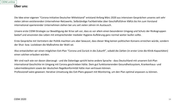 Für eine Initiative des deutschen Mittelstands – dieser besteht in erster Linie aus Familienunternehmen, die gesellschaftspolitisch sehr konservativ eingestellt sind – sind die Verlautbarungen von CIDM.online sehr aufmüpfig, nachgerade antiautoritär. So wird der Lockdown vom 23. März als „evtl. übertrieben, da Abschwung bereits eingeleitet“ bezeichnet. Der am 27.April eingeführten Maskenpflicht wird bescheinigt: „Kein Covid-19-Effekt erkennbar“. Schließlich wird über die seit einiger Zeit wieder ansteigende Zahl positiv Getesteter gesagt, dass Trendaussagen allein auf der Basis der absoluten Zahlen, d.h. ohne sie in Relation zur Häufigkeit der Testungen zu setzen, sinnlos seien ( vgl. oben den Gegensatz von „Panik“-Kurve und „Real“-Kurve ). Und nun die Ohrfeige: „Führende deutsche Medien machen sich mit haftbar aufgrund bewusster oder fahrlässiger Informations-Irreführung, solange sie weiter „Infizierten“-Zahlen ohne Relationsbezug als die wichtigste Kenngröße kommunizieren“. Angesprochen fühlen sollten sich ARD und ZDF in ihrem Zusammenspiel mit dem RKI, die führenden Printmedien und alle in der großen Corona- Koalition befindlichen Parteien mit ihren medialen Äußerungen.