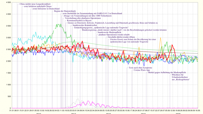Nachtrag: Eines zeigt dieser neue Monatsbericht deutlich: Wenn sich nun ausgerechnet nach Einführen einer umfassenden Maskenpflicht, die Situation der Atemwegsinfektionen auf das in dieser Jahreszeit übliche Niveau eingependelt hat, dann ist dies ein belastbares Indiz dafür, dass die Maskenpflicht, die üblichen Infektionen nicht beeinflusst. Es sei denn, sie würde spezifisch nur SARS-CoV-2 aufhalten, denn dieser Erreger kommt ganz offensichtlich sehr selten, im Gegensatz zu Influenza- oder Rhinoviren, vor. Da jedoch bezgl. wissenschaftlich-rationaler Redlichkeit schon alle Schamgrenzen gefallen sind, wird dies ganz bestimmt demnächst einer der üblichen Experten behaupten.