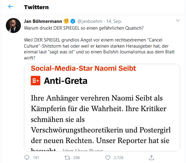 Quelle: Twitter. https://twitter.com/janboehm/status/1305442089262616576?ref_src=twsrc%5Etfw%7Ctwcamp%5Etweetembed%7Ctwterm%5E1305442089262616576%7Ctwgr%5Eshare_3&ref_url=https%3A%2F%2F19vierundachtzig.com%2F2020%2F09%2F17%2Fherrlich-boehmermann-wuetet-ueber-spiegel-portraet-ueber-naomi-seibt%2F