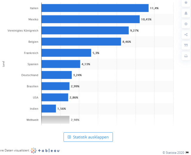 Sofern diese Grafik stimmt, ist Trump bezüglich der Covid-19-Bekämpfung erfolgreicher als unsere vom Redakteur so hochgelobte Kanzlerin, denn in seinem Land ist die Mortalität immerhin um ca. 12 % geringer und liegt immerhin knapp unter dem weltweiten Durchschnitt, während die von Deutschland darüber liegt