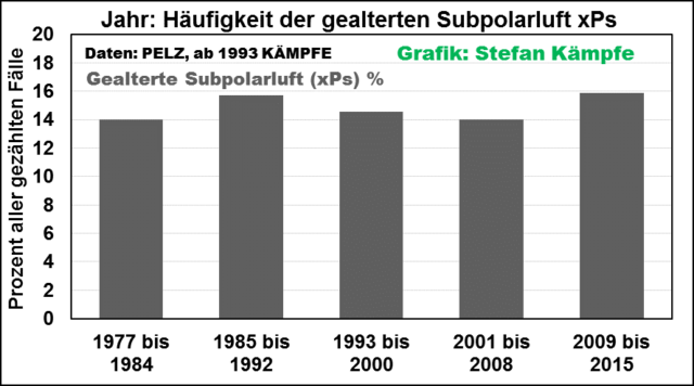 Abbildung 2: Während mP als unsere häufigste Luftmasse ihren Häufigkeitsanteil zwischen 20 und 30% behaupten konnte, wurde xP seltener und mPs etwas häufiger – jedoch ohne Signifikanz.