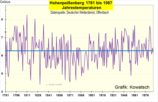 Nun lag zufälligerweise das Startjahr 1881 in einem Kältetal in Mitteleuropa, was man gut an der längeren Temperaturreihe des Hohenpeißenberges erkennen kann.