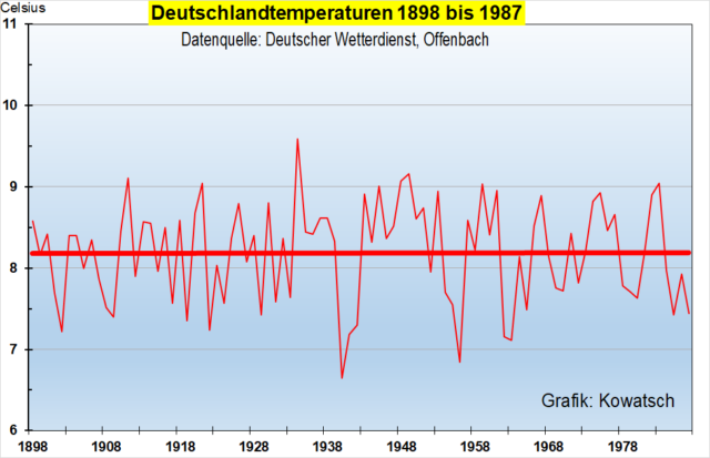 Abb. 2: 90 Jahre lang gab es laut DWD-Temperaturreihe keinerlei Erwärmung in Deutschland, trotz stark steigender CO2-Konzentrationen in der Atmosphäre. Hat die CO2-Erwärmungswirkung etwa 90 Jahre lang ausgesetzt?