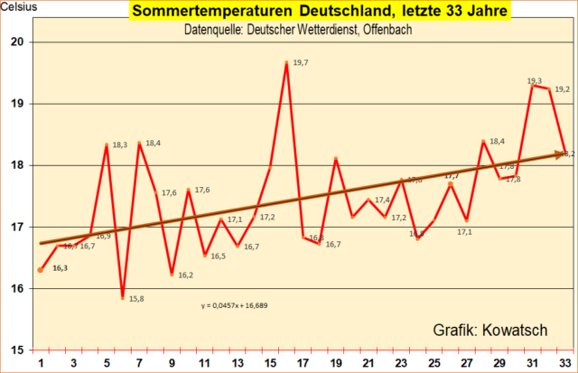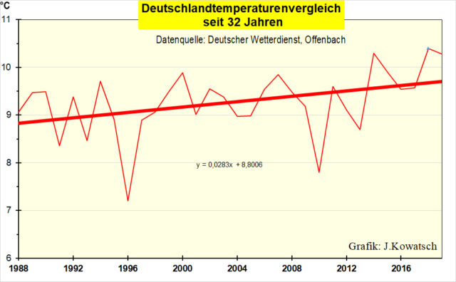 Die angebliche CO2-Treibhauserwärmung ist eine wissenschaftliche Verwechslung mit dem zunehmenden Wärmeinseleffekt. Diesen gibt es nicht nur in Deutschland, sondern überall auf der Welt hat die Bebauung zugenommen. Auf den Weltmeeren wirken die natürlichen Ursachen der Klimaerwärmung seit 1850, dem definierten Ende der kleinen Eiszeit.