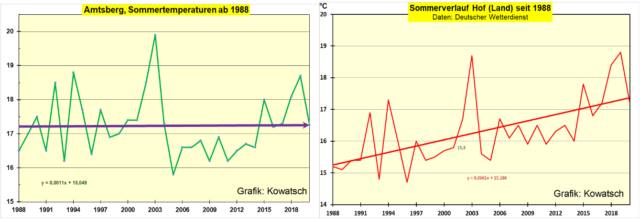 Abb. 6: Wärmeinselarme Stationen zeigen wie alle deutschen Wetterstationen zwar den Temperatursprung 1988, die Temperaturen hielten sich jedoch auf dem milderen Niveau, während die Stationen in wachsenden Wärmeinseln insbesondere im Sommer weiter wärmer wurden. In den letzten Jahren hat die Wetterstation Hof, die seit Jahren in ein Gewerbegebiet eingebaut wird das tiefer liegende und ländliche Amtsberg-Dittersdorf im benachbarten Sachsen überholt.