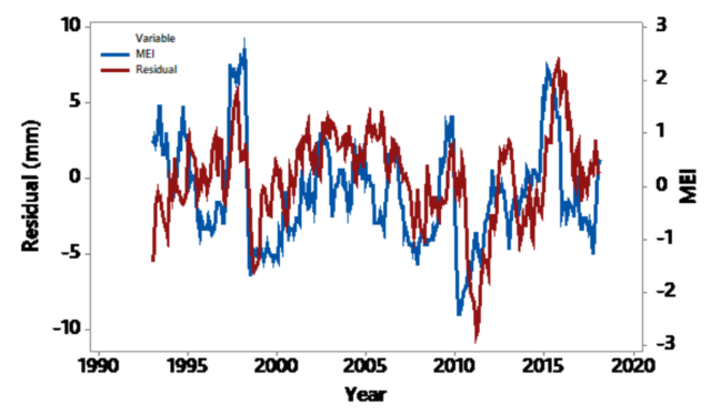 Fig. 3. MEI and Solution I monthly OLS residuals (mm) during the SA period. – Bild 4 [5] Korrelation der Pegel-Residuen (Bild 3) mit den ENSO-Zyklen