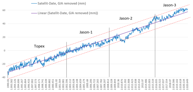 Man muss sich klar machen, dass die Satelliten aus ca. 1.320 km Entfernung den Meeres-Pegel auf den Millimeter genau messen können sollen (was auf Meereshöhe und direkt daneben angeblich nur ungenau erfolgt). Das mag theoretisch stimmen, wenn man alleine die Laufzeit-Messgenauigkeit betrachtet. In Wirklichkeit wird die Laufzeit das Messsignal jedoch durch externe Einflüsse verfälscht, teils driften die Messapparaturen und die Satelliten selbst „taumeln“ mit den Änderungen des Erd-Schwerefeldes. Den Pegelwert bekommt man erst nach vielen, vielen Korrekturen und Anpassungen. Teils werden diese sogar noch nach Jahren nachträglich korrigiert. Es ist also gar nicht sicher, dass die Satelliten-Pegelmesskurve wirklich mit der angegebenen Genauigkeit stimmt.