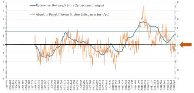 Bild 7 Satelliten-Pegel-Änderungsrate (Residuals) als Absolutwerte und als Steigungswerte der Regressionsgeraden. Grafik vom Autor erstellt